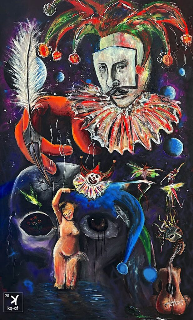 Feathers, jesters, lovers, and stars orbit his mask — the theatre of humanity revealed as divine comedy.