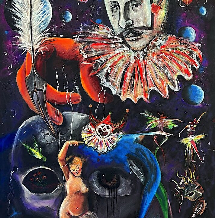 For four months, he painted daily — Lady Macbeth’s lament melting into Juliet’s rose; jesters as stars, muses as planets.